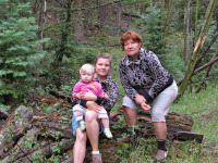 We put Zoya in her green wagon and started to walk down: Indiana wasn’t on his leash, he was ahead of us in his search mode and the rest of us were walking slowly with the wagon and talking. 5 minutes into the walk there was a turn on a very slopey area, we all looked down so as to be careful not to step on the sharp rocks. A minute later I lifted my eyes to look for Indiana and there he was 50 steps away from me sniffing something under the bush and another 40 steps behind was Indiana!!!!!!!!!! A bear cub sitting and looking straight at us (or perhaps smelling Indiana). I froze in my tracks: panic swooshed over me. Before I even said a word (Mom was occupied with Malia walking carefully down the slope after me) the wave of thoughts attacked my mind: I had Zoya behind me sitting in the wagon and Indiana sniffing something between me and the bear-cub and the most striking was the question that immediately pooped in my mind: "If there is a cub, then where is the mama-bear?" I said to Mom: "Bear". It was all I could manage at a time. Mom stopped in her tracks and started to call Indiana, the cub moved and ran away. "There are two of them", Mom said, "We better turn back". Surprisingly Indiana came straight to us, I think he even didn’t notice the bear (by being so occupied with other smells around), so we slowly started to move back up. Well, it was the first time when I saw a bear in the wild. I can't tell that I was scared, but I was worried a bit for Zoya and Indiana. Afterword I told myself that I wish I had a camera on hand, but right there seeing the bear that looked straight at us it didn't cross my mind at all.