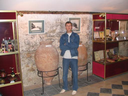 Dima between barrels of wine |