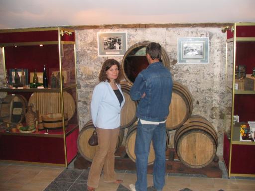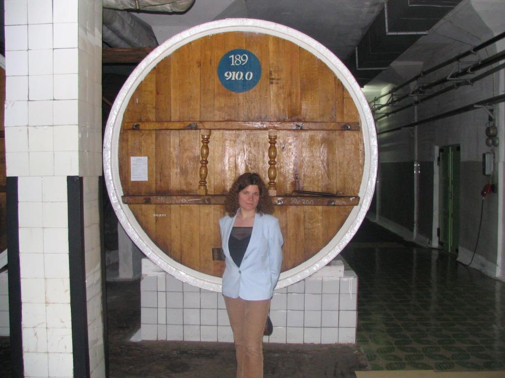 Yuliya in front of the barrel of wine |
